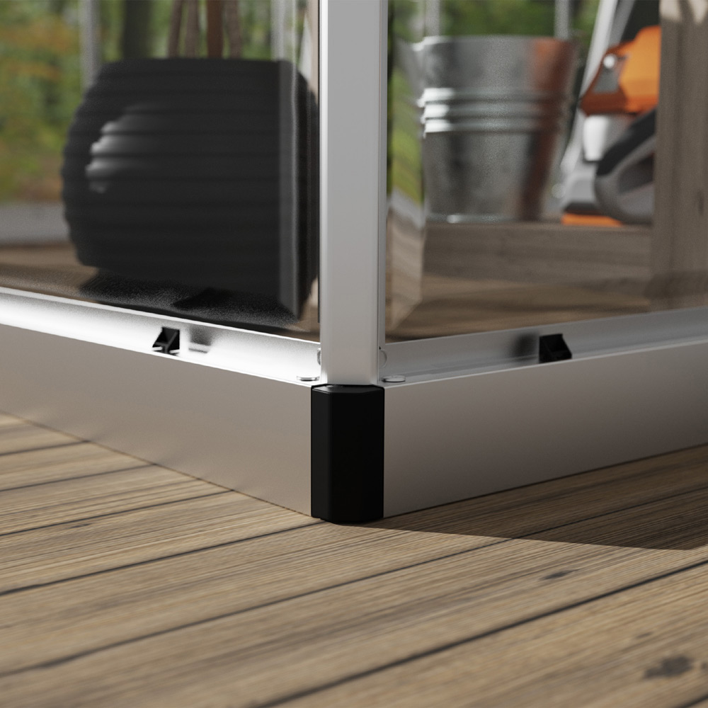 - בסיס היקפי מפלדה מגולוונת שאינה מחלידה, כולל חורים מובנים לעיגון החממה למשטח קשיח, להגברת העמידות והיציבות