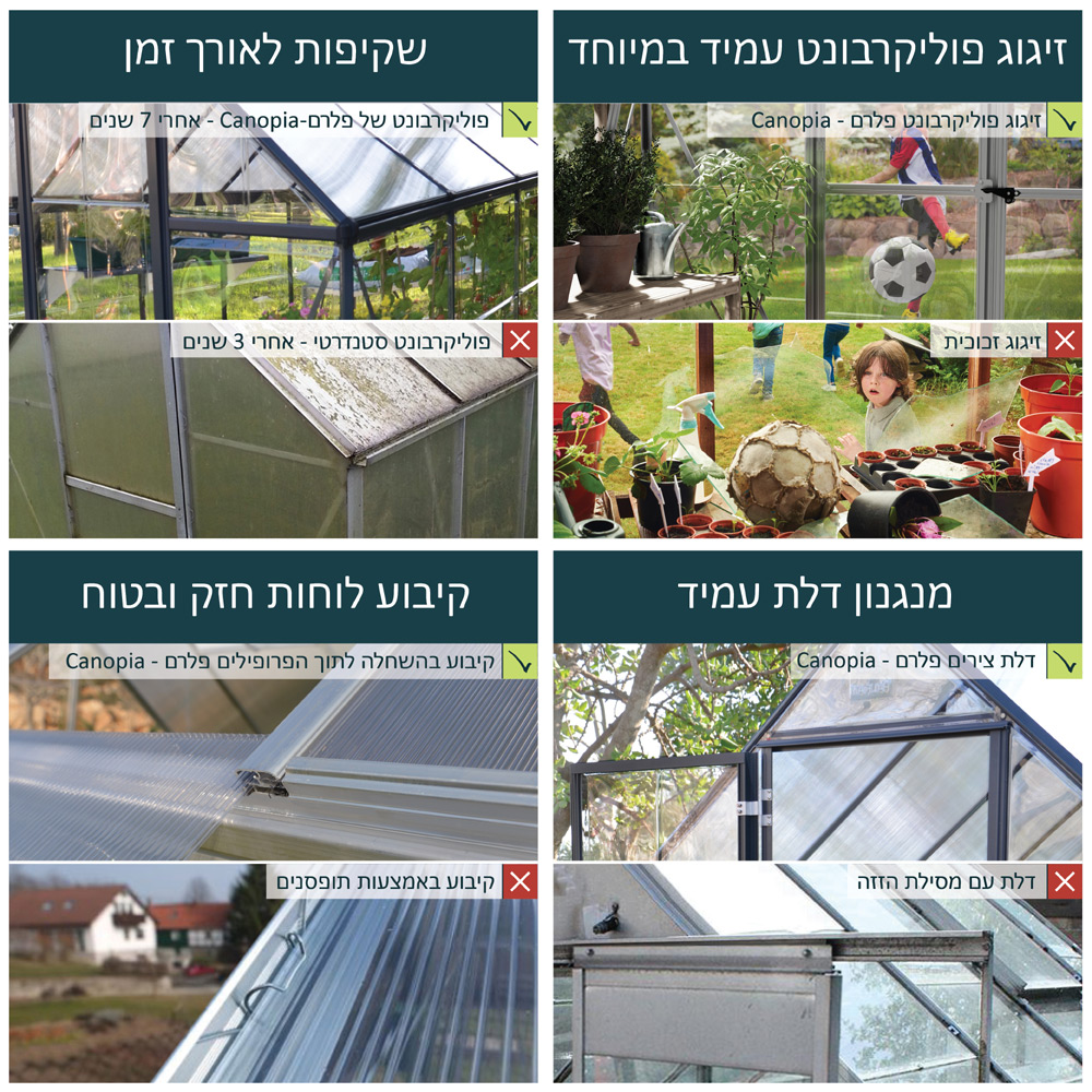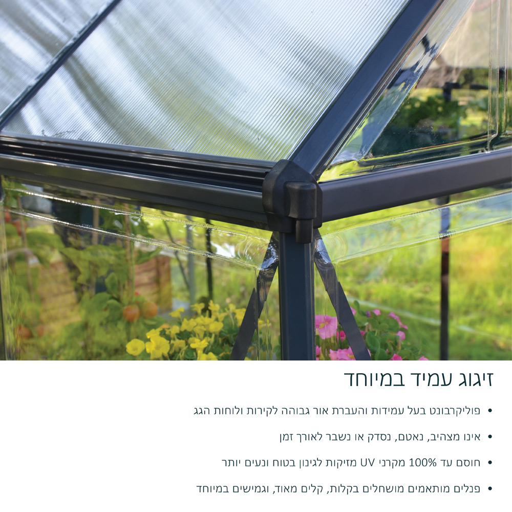 השילוב של הפוליקרבונט העמיד עם מסגרת האלומיניום המחוזקת והעמידה בפני חלודה, מספקת לכם חממה מעוצבת וחזקה,