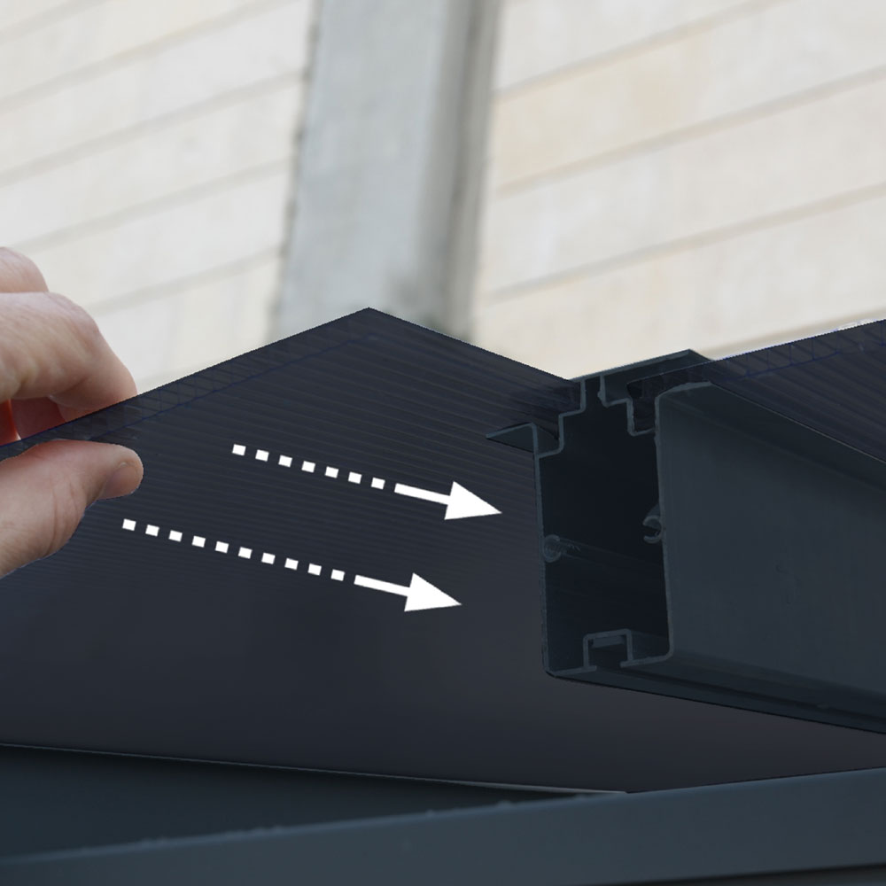 העברת אור: קירוי גג פוליקרבונט אפור אטום בעל זיגוג מלא וטכנולוגית HEAT BLOCK מוריד את הטמפרטורה באזור המוצל ומגן מחשיפה ישירה לאור השמש